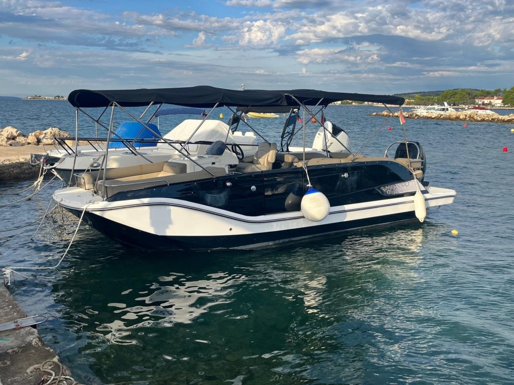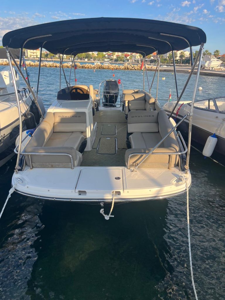 Bayliner Element XR7, 2015-ös, jó állapotú, használt külmotoros ponton motorcsónak, gyári képviselettől, Mercury XL Verado 250 LE motorral, bruttó 13.900.000.-Ft akciós áron eladó utánfutóval Vir szigeten, Horvátországban.